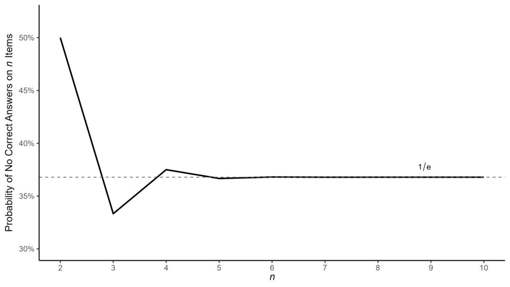 It’s cool that we were able to use computers and intuition to show that the probability of getting no correct answers approaches \frac{1}{e} as the number of questions increases. However, ideally, we’d show mathematically that