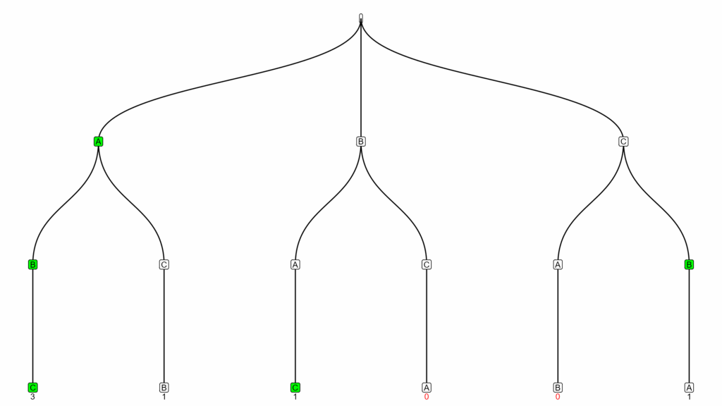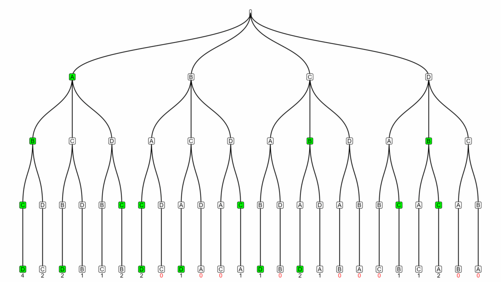 The six arrangements are ABC, ACB, BAC, BCA, CAB, and CBA. The right answers are plotted in green, and the number of correct answers for each arrangement is indicated below each branch. We see that there’s only one way to get all the right answers. Additionally, it’s impossible to get n-1 correct answers because the last option will be good if all the others were correct.